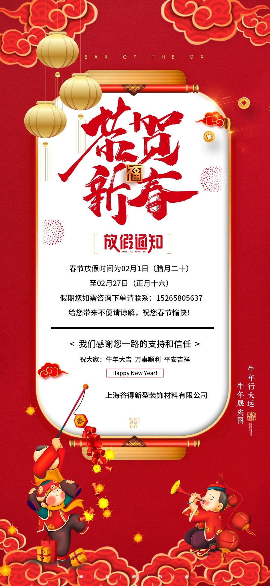 衷心感谢您过去一年的支持与信任,也衷心感谢上海谷得新型装饰材料全体家人这一年的辛勤付出。春节来临之际,公司2021年春节放假安排如下: